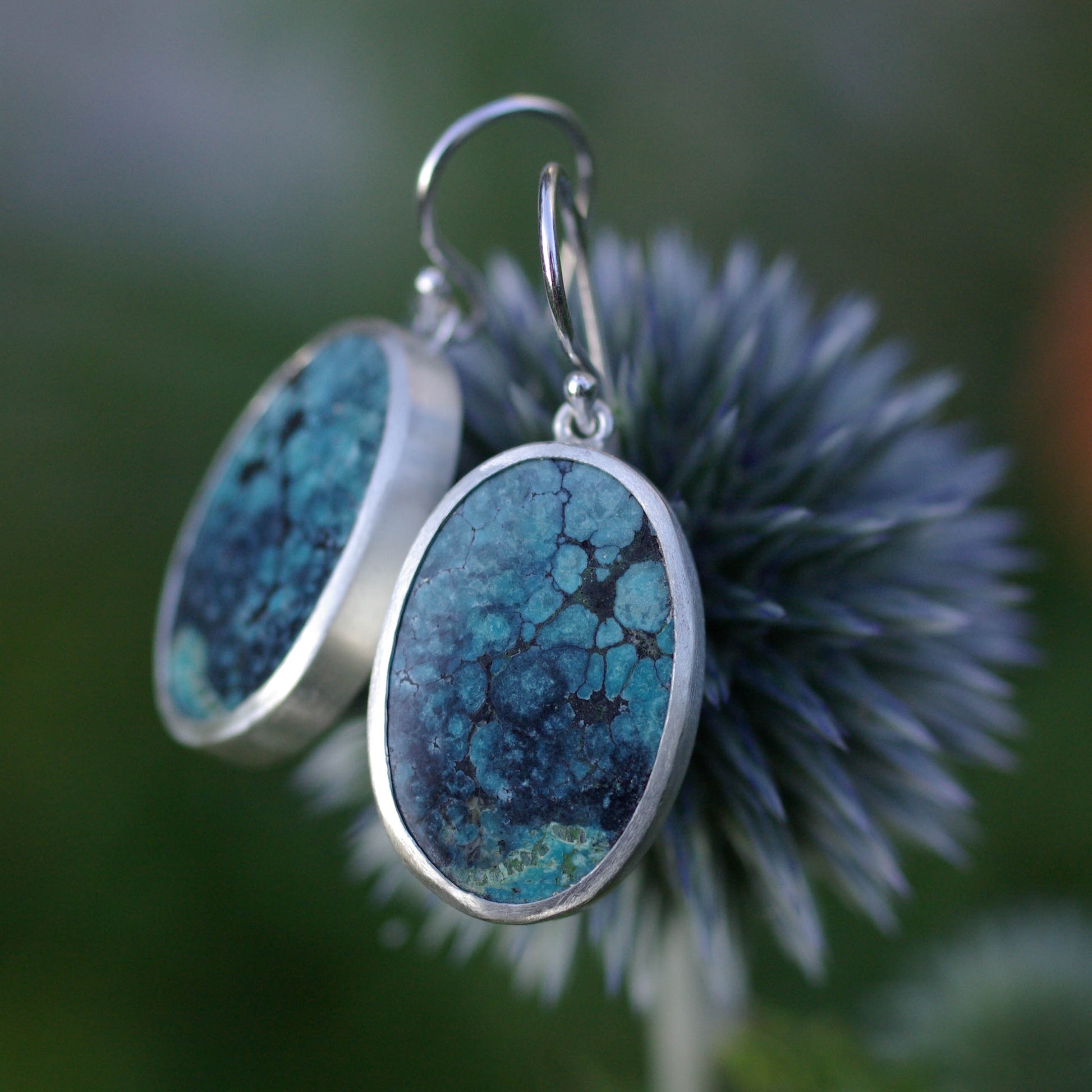Chaque boucle met en valeur une pierre ovale naturelle, simplement sertie en clos, montée sur un crochet fin en argent pour laisser la pierre accompagner chaque mouvement.