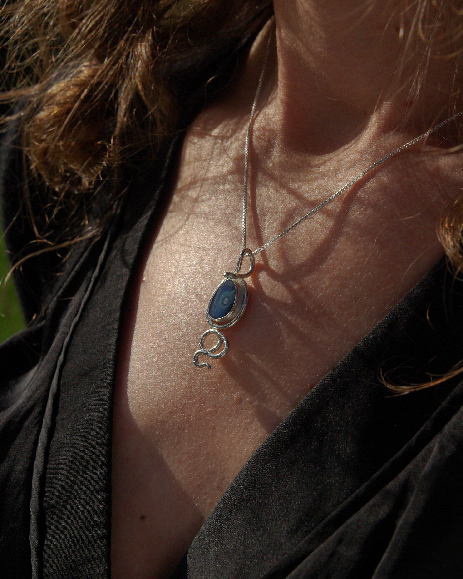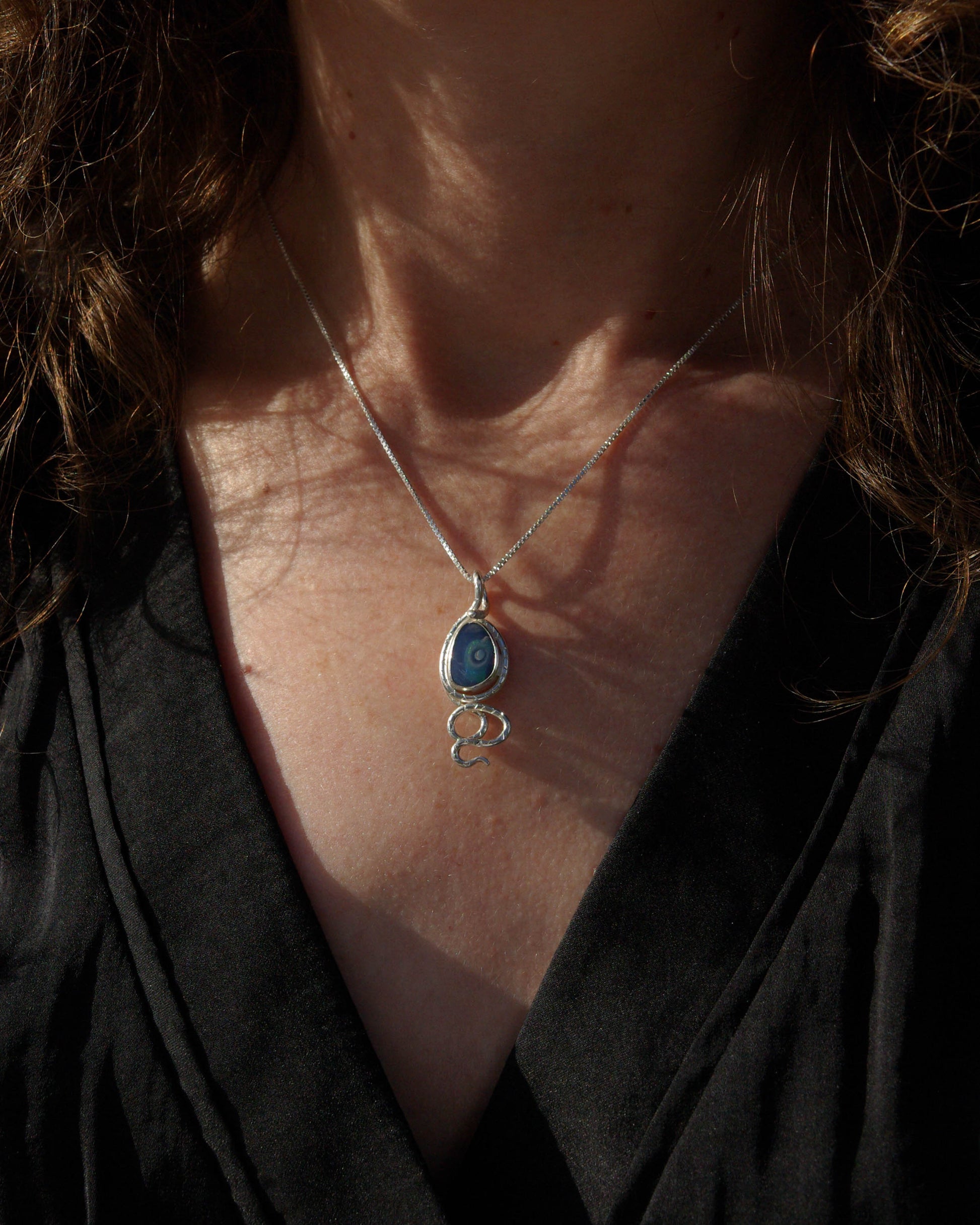Inspiré des bijoux de la rome antique. Le pendentif phare de la collection Luminescences associe une opale doublet bleu foncé aux motifs de galaxie à un serpent sculpté en argent. Une pièce mystique, puissante et lumineuse, qui allie élégance cosmique et savoir-faire artisanal.