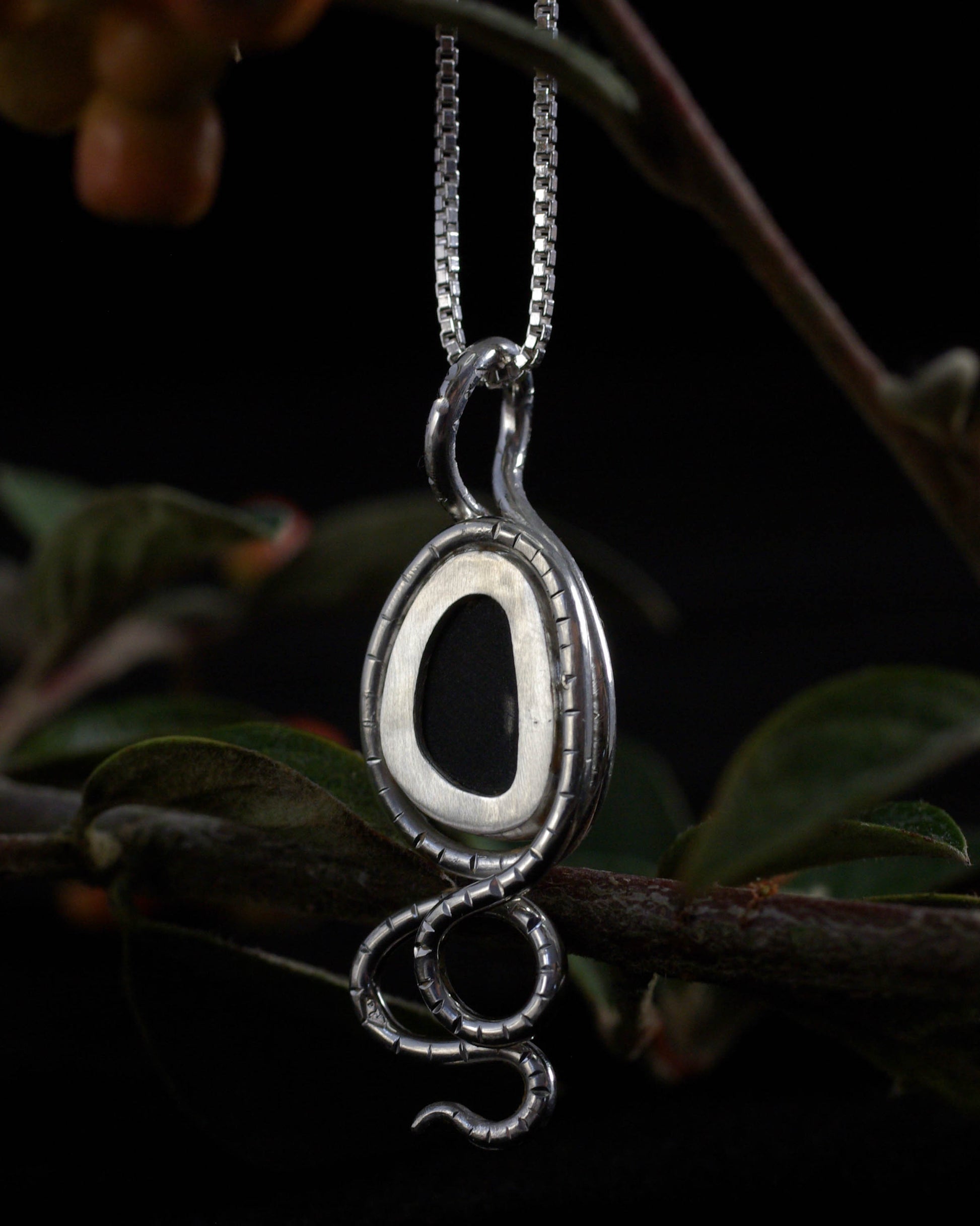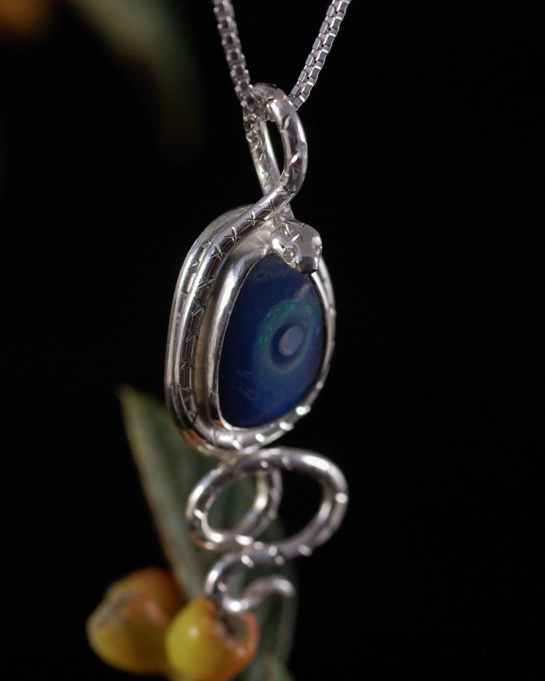 Le serpent entoure l’opale, formant une sorte de cercle protecteur autour de la pierre. Son corps sert également de bélière au pendentif, ce qui lui donne une intégration très naturelle.